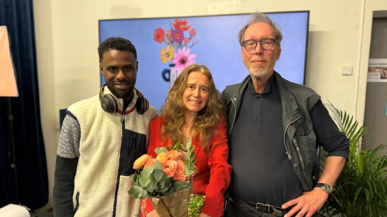 Gilbert Svensson höll i avtackningen av Karin Schill som lämnade RÖK:s styrelse efter 16 år, varav de sista 6 åren som ordförande. Med på bilden är också Mohamed Gutale som jobbat med Karin sen han var 15 år och deltog i projektet Ung Arena. Foto: Roozbeh Behtaji.